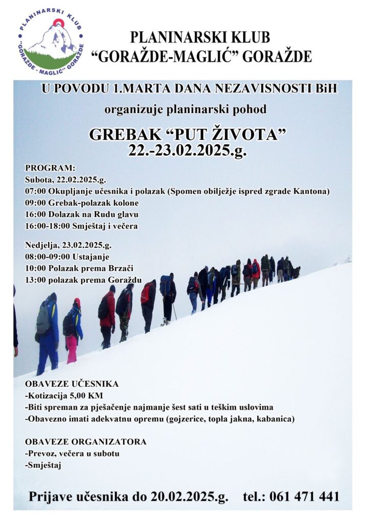 Pohod Grebak Ruda glava- Put zivotaDana 25.2.2025. Polazak iz Sarajeva u 7,30Organizovani prevoz Sarajevo Grebak. Sa Grebka se krece markiranom stazom iznad sela Jabuka gde nas ceka grupa planinara iz Gorazda zajedno nastavljamo put preko prevoja zvani Kacelj sve do Rude glave. Dolazak u dom je planiran oko 17 casova duzina staze je 17 km. […]